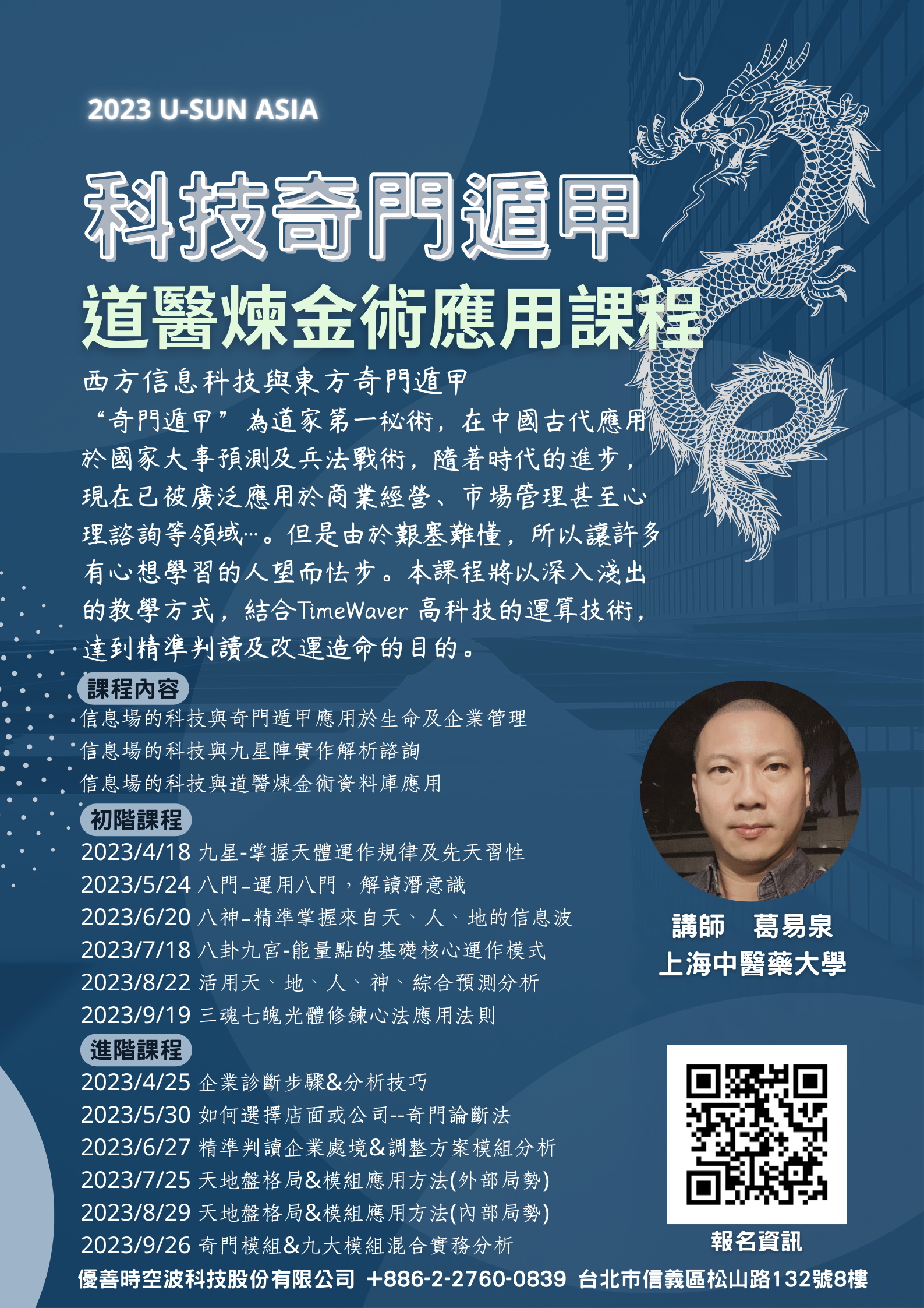 “奇門遁甲”為道家第一秘術,在中國古代應用於國家大事預測及兵法戰術,隨著時代的進步,現在已被廣泛應用於商業經營、市場管理甚至心理諮詢等領域…。但是由於艱塞難懂,所以讓許多有心想學習的人望而怯步。本課程將以深入淺出的教學方式,結合TimeWaver 高科技的運算技術,達到精準判讀及改運造命的目的。