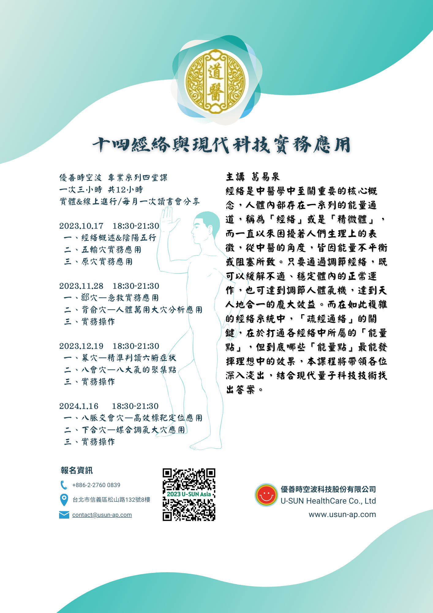經絡是中醫學中至關重要的核心概念,人體內部存在一系列的能量通道,稱為「經絡」或是「精微體」,而一直以來困擾著人們生理上的表徵,從中醫的角度,皆因能量不平衡或阻塞所致。只要通過調節經絡,既可以緩解不適、穩定體內的正常運作,也可達到調節人體氣機,達到天人地合一的龐大效益。而在如此複雜的經絡系統中,「疏經通絡」的關鍵,在於打通各經絡中所屬的「能量點」,但到底哪些「能量點」最能發揮理想中的效果,本課程將帶領各位深入淺出,結合現代量子科技技術找出答案。