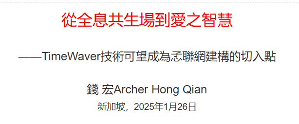 TimeWaver技術以其量子資訊場與生物能量的動態調節能力,為調節身心靈健康、實現全息共生提供了獨特的路徑,同時可望為驗證“時空意間觀”和互動主體共生(Intersubjective Symbiosism)哲學思維的實踐奠定基礎。這種技術不僅在醫學層面展現潛力,更可成為建構“愛之智慧孞聯網”(Amorsophia MindsNetworking)的切入點,為人類從贖罪獲救走向贖福共生提供一種可操作的實現方式。